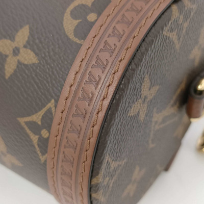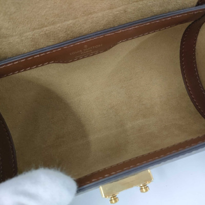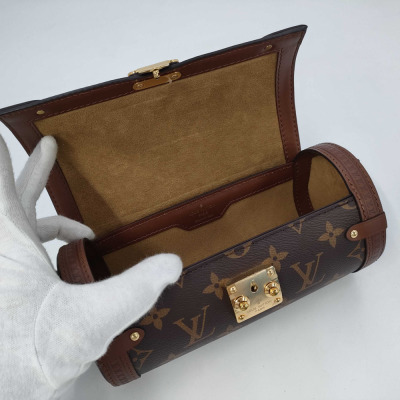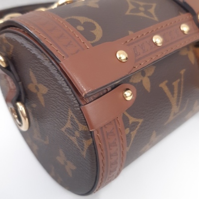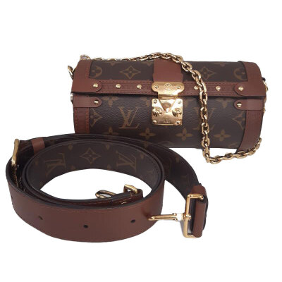 Louis Vuitton Papillon Trunk in Monogram coated canvas, with brown, LV logo embossed leather trim. Featuring gold-toned hardware, a detachable chain handle, and detachable & adjustable wide leather shoulder strap. The push-lock closure opens to a spacious brown microfibre interior. Approximate dimensions: 20cm(L) x 9cm(H) x 9cm(D), handle 17cm, strap drop 52cm. With Entrupy Certificate of Authenticity. (Pre-owned)