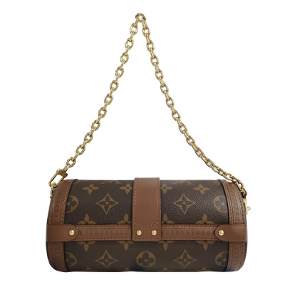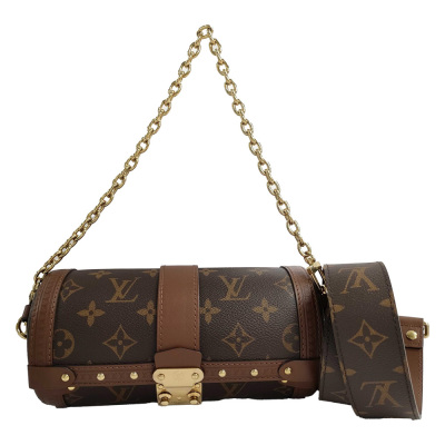 Louis Vuitton Papillon Trunk in Monogram coated canvas, with brown, LV logo embossed leather trim (RFID confirmed). Featuring gold-toned hardware, a detachable chain handle, and detachable & adjustable wide leather shoulder strap. The push-lock closure opens to a spacious brown microfibre interior. Approximate dimensions: 20cm(L) x 9cm(H) x 9cm(D), handle 17cm, strap drop 52cm. With Entrupy Certificate of Authenticity. (Pre-owned)