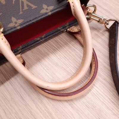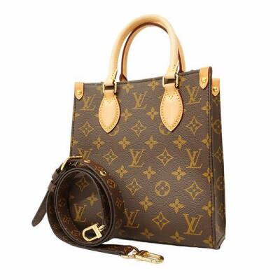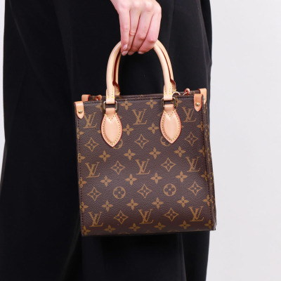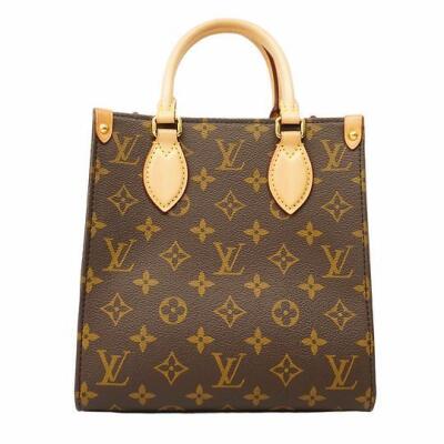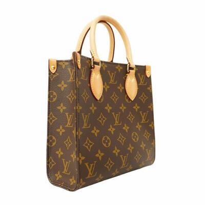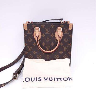 Louis Vuitton Sac Plat BB in Monogram coated canvas with natural cowhide leather trim. Featuring gold-toned hardware, dual rolled handles, and removable and adjustable shoulder strap. The top opens to a red textile interior with three patch pockets and a zip pocket. Approximate dimensions: 21cm(L) x 22cm(H) x 9cm(D), handle drop 8.5cm, strap drop 56cm. Accompanied by a LV dust bag. With Entrupy Certificate of Authenticity. (Pre-owned)