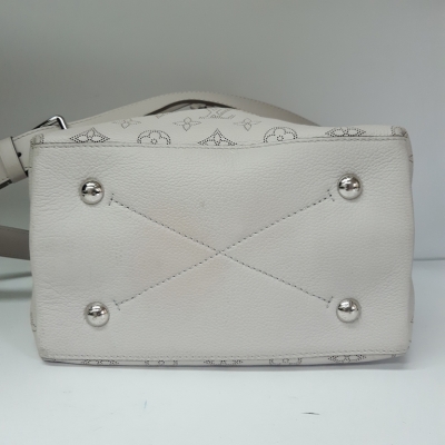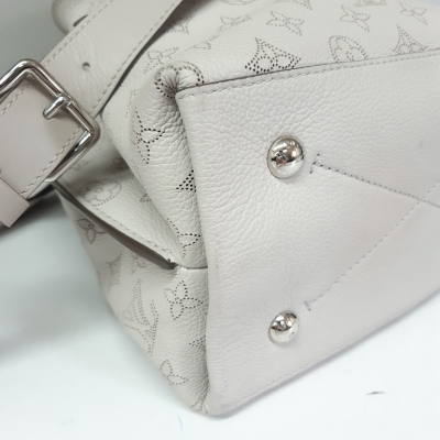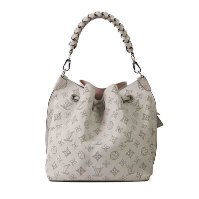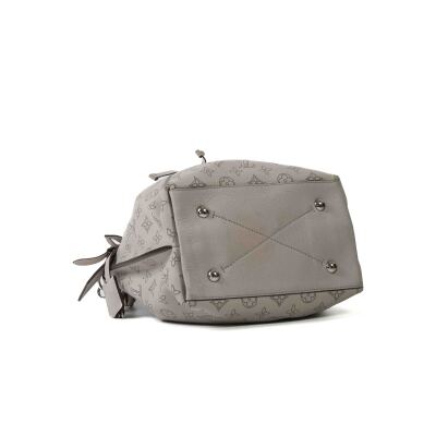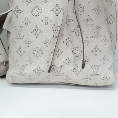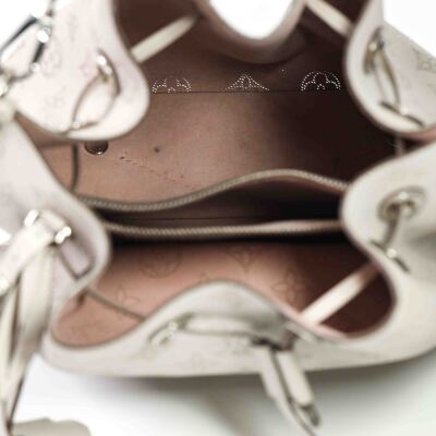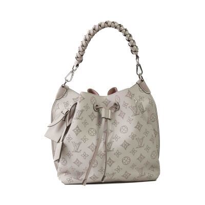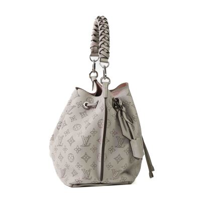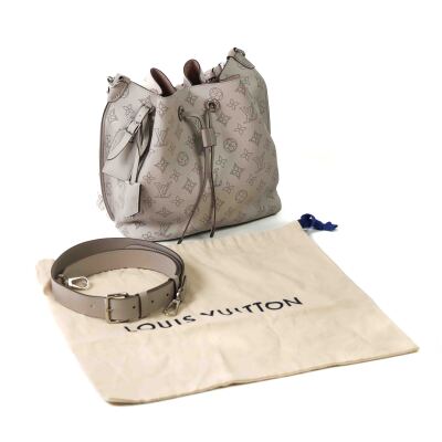 Louis Vuitton Mulia bucket bag in light grey Mahina calfskin. Featuring Monogram perforated, silver-toned hardware, single braided handle and a pull cinch cord closure. The top opens to a pink suede interior with a zipped pocket in the middle. Approx dimensions: 24cm(L) x 25cm(H) x 15cm(D), 13.5cm handle drop and 55cm detachable and adjustable strap drop. Accompanied by padlock, keys, crochet, name tag and a dustbag. With Entrupy Certificate. (Pre-owned)