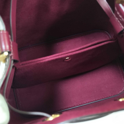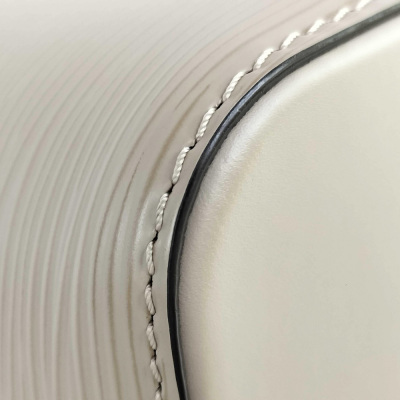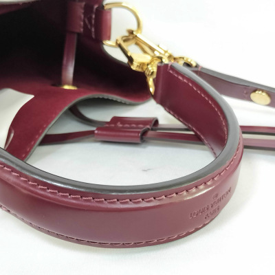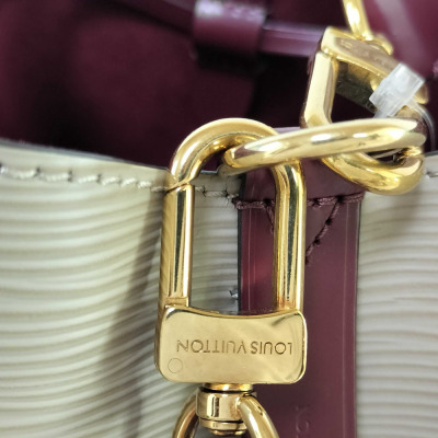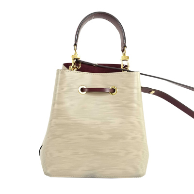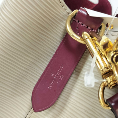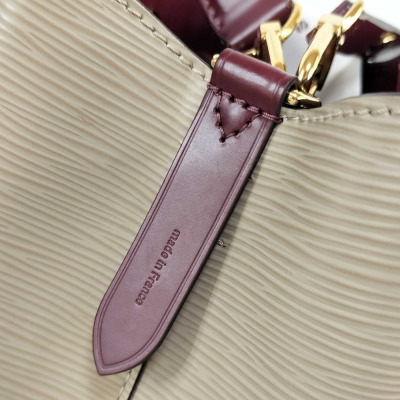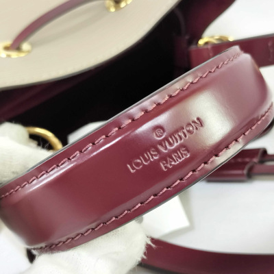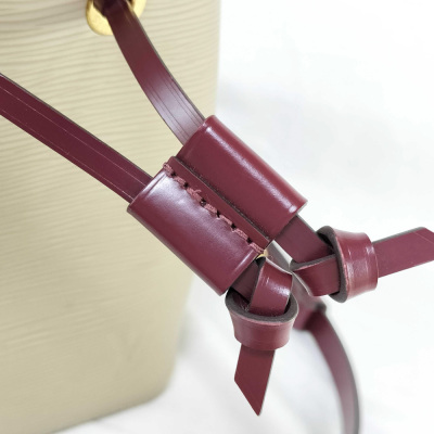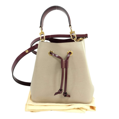 Louis Vuitton NeoNoe BB bag in beige Epi leather. Featuring gold-toned hardware, and detachable Maroon flat top handle. The Maroon leather drawstring closure opens to Maroon microfiber interior divided into two compartments by a pocket with button closure. Approximate dimensions: 20cm(L) x 21cm(H) x 13cm(D), detachable handle drop 12cm, detachable shoulder strap drop 55cm, adjustable. Accompanied by LV dustbag. With Entrupy Certificate of Authenticity. (Pre-owned)