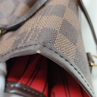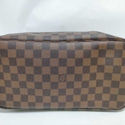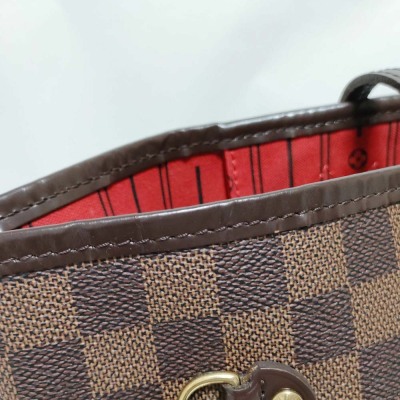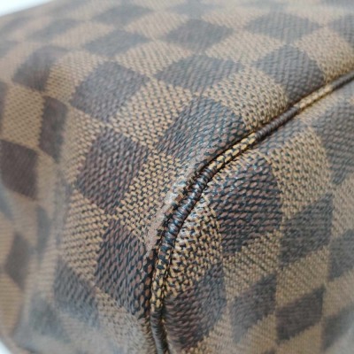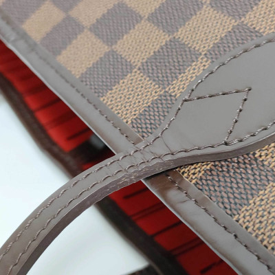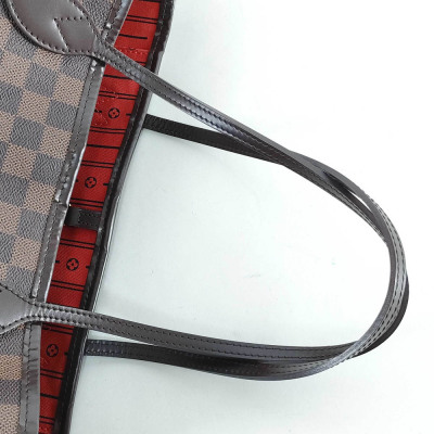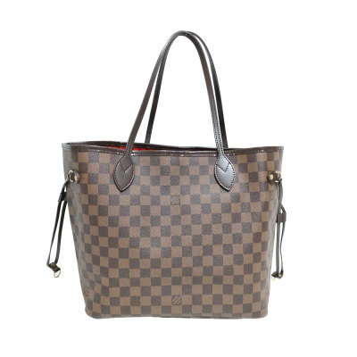 Louis Vuitton Neverfull MM in Damier coated canvas (year 2011). Featuring brown leather trim, 4 side laces and handles, and gold-toned hardware. The hook closure opens to red striped textile lined interior with a zipper pocket. Approximate dimensions: 31cm(B-L) x 29cm(H) x 16cm(D), strap drop: 20.5cm. With Entrupy Certificate of Authenticity. (Pre-owned)