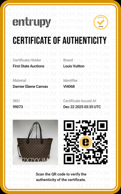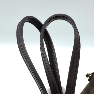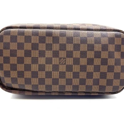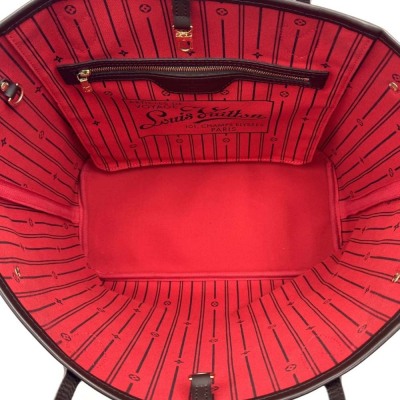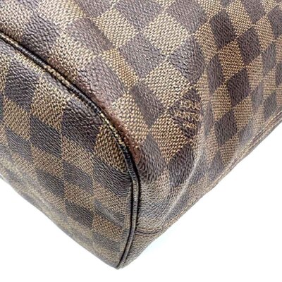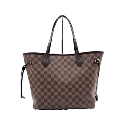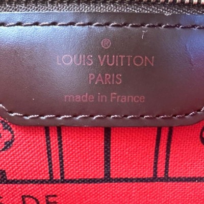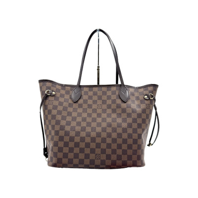 Louis Vuitton Neverfull MM in Damier Ebene coated canvas, with natural brown leather trim (circa: 2008). Featuring gold-toned hardware, side laces, and dual flat leather handles. The open top with a hook closure reveals to a red striped textile lining with a zipper pocket. Approximate dimensions: 32cm (base-L) x 28.5cm (H) x 16cm (D), with a 21cm handle drop. With Entrupy Certificate of Authenticity. (Pre-owned)