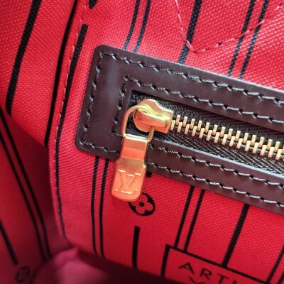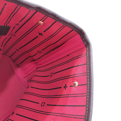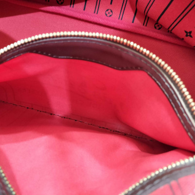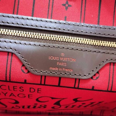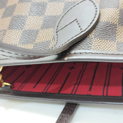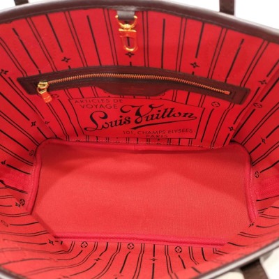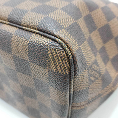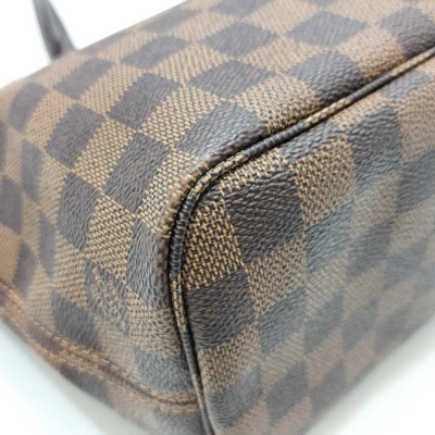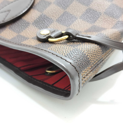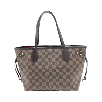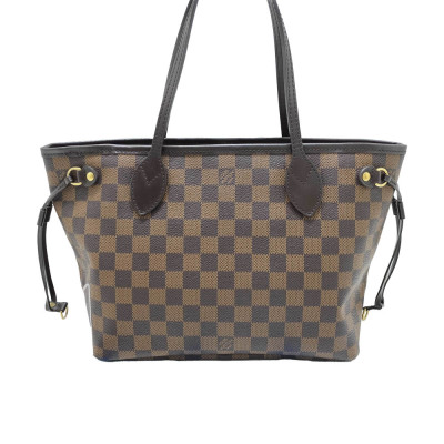Louis Vuitton Neverfull PM in Damier coated canvas. Featuring brown leather trim, 4 side laces and handles, and gold-toned hardware. The hook closure opens to red striped textile lined interior with a zipper pocket. Approximate dimensions: 28.5cm(Base-L) x 22cm(H) x 13cm(D), strap drop 17.5cm. With Entrupy Certificate of Authenticity. (Pre-owned)