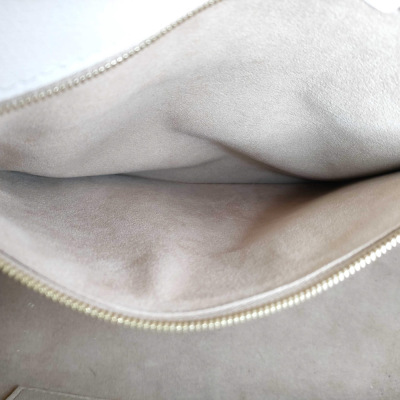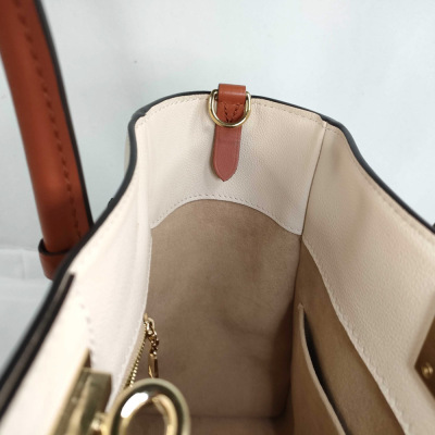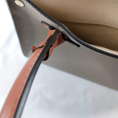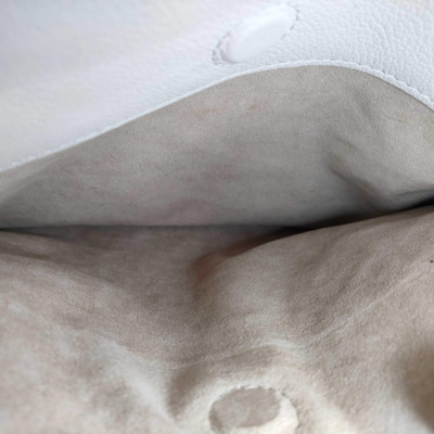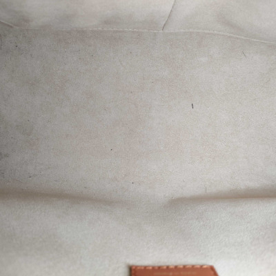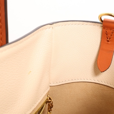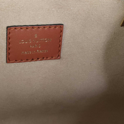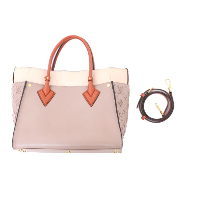 Louis Vuitton On My Side MM bag in beige and taupe grained calf leather. Featuring gold-toned hardware, Monogram tufting on the sides, 2 exterior pockets with magnetic closures at the front and back, 2 patch pockets on the sides, rolled top handles and a detachable leather strap in terracotta colour. The turn-lock closure opens to a beige microfibre interior with zippered and patch pockets. Approximate dimensions: 31cm(W) x 24cm(H) x 14cm(D), with a 11.5cm handle drop and 44cm adjustable strap drop. With Entrupy Certificate of Authenticity.