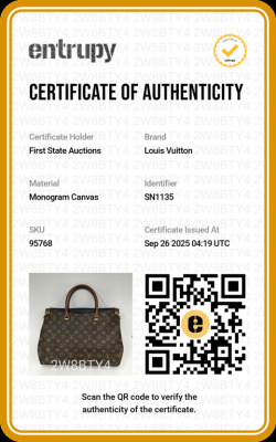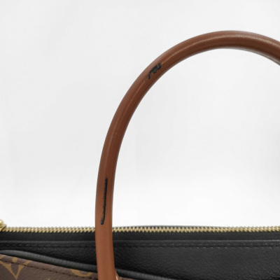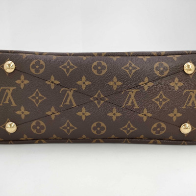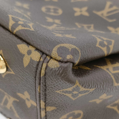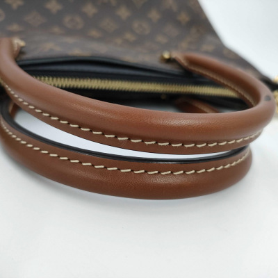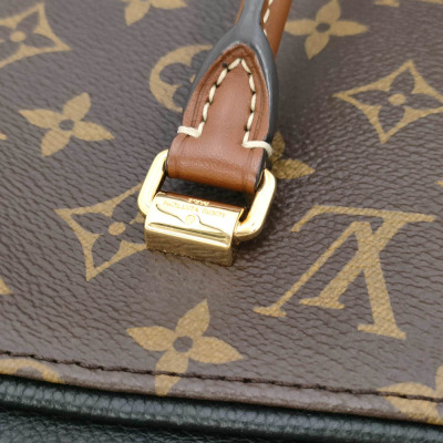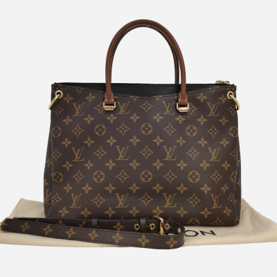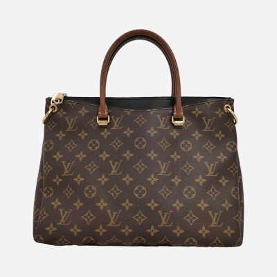 Louis Vuitton Pallas MM in Monogram canvas and black leather. Featuring exterior pockets at front and rear, gold-toned hardware, rolled brown leather handles. The top zip closure opens to black microfiber lining interior with patch pocket. Approximate dimensions: 34cm(L) x 26cm(H) x 12.5cm(D), 11cm handle drop, 30cm strap drop, adjustable. Accompanied by a LV dustbag. With Entrupy Certificate of Authenticity. (Pre-owned)
