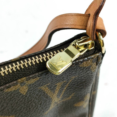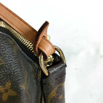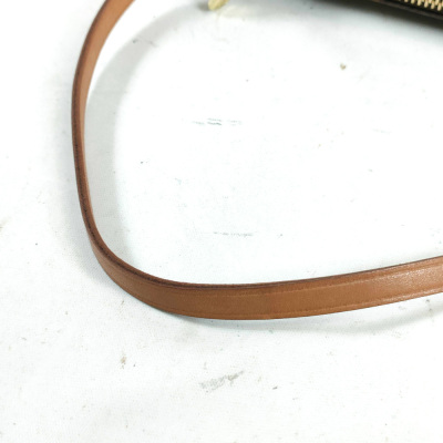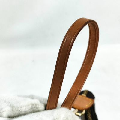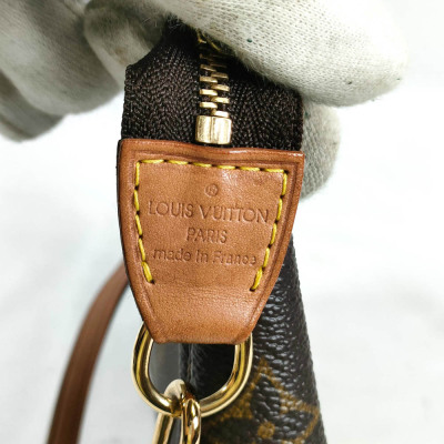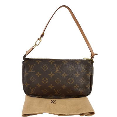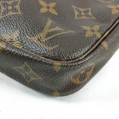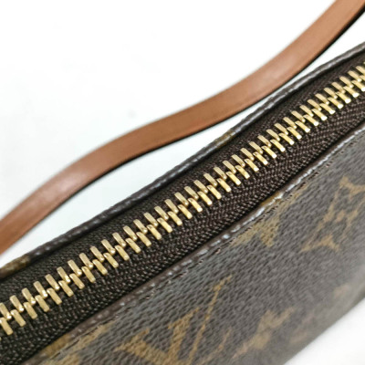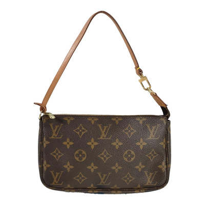 Louis Vuitton Pochette Accessoires in Monogram coated canvas. Featuring gold-toned hardware, convertible vachetta leather carry strap to wrist strap. The zipper closure opens to a dark brown textile interior. Approximate dimensions: 21.5cm(L) x 12cm(H) x 4cm(D), strap drop 15cm. Accompanied by Louis Vuitton dustbag. With Entrupy Certificate of Authenticity. (Pre-owned)