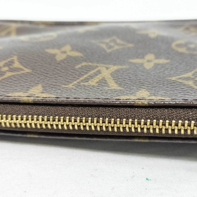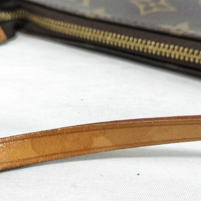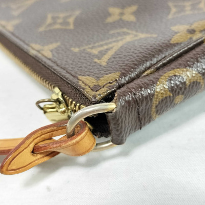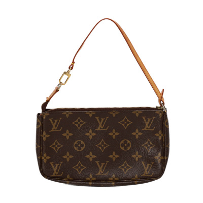 Louis Vuitton Pochette Accessoires in Monogram coated canvas (circa: 2005). Featuring gold-toned hardware and a convertible vachetta leather carry strap to wrist strap. The zipper closure opens to a dark brown textile interior. Approximate dimensions: 21.5cm(W) x 12cm(H) x 4cm(D), with a 15cm strap drop. With Entrupy Certificate of Authenticity.