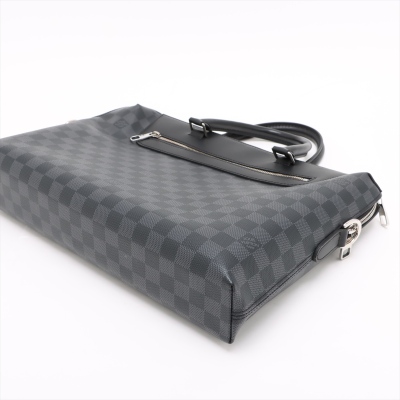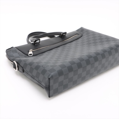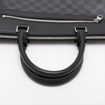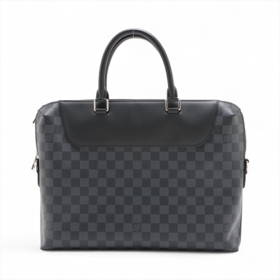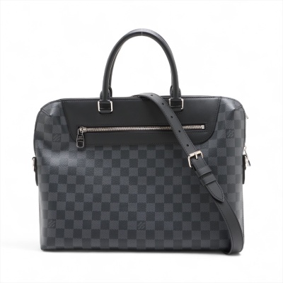 Louis Vuitton Porte-Documents Jour NM briefcase in Damier Graphite coated canvas and black smooth leather (RFID confirmed, circa: after 2021). Featuring silver-toned hardware, dual rolled handles, a front zippered pocket and a detachable strap. The top zipper opens to a black textile lining interior with multi-patched pockets. Approximate dimensions: 37cm(W) x 29cm(H) x 7cm(D), with a 11cm handle drop and 58cm adjustable strap drop. Accompanied by a Louis Vuitton dustbag for the leather strap and shoulder pad. With Entrupy Certificate of Authenticity.