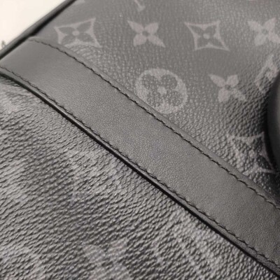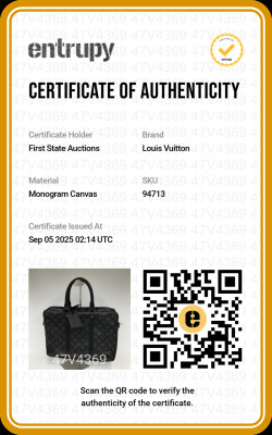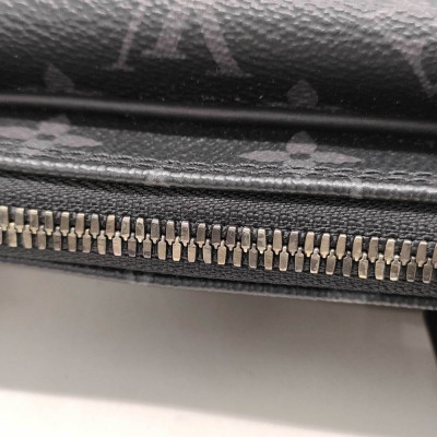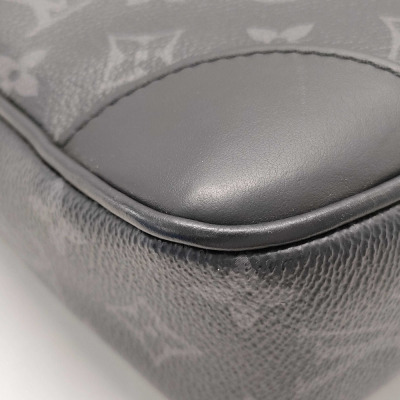Louis Vuitton Porte-Documents Voyage PM in Monogram Eclipse coated canvas with black leather trim. Featuring rolled leather top handles, front exterior patch pocket, silver-tone hardware. The zipper closure opens to a black textile lining interior with patch pockets. Approximate dimensions: 36cm(L) x 27cm(H) x 6cm(D), 11.5cm handle drop. Accompanied by padlock, keys, nametag. NOTE: shoulder strap NOT included. With Entrupy Certificate of Authenticity. (Pre-owned)