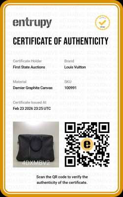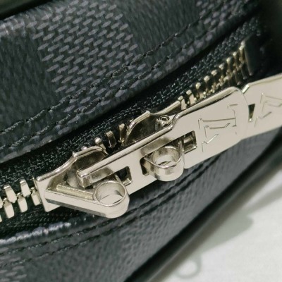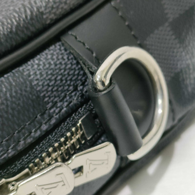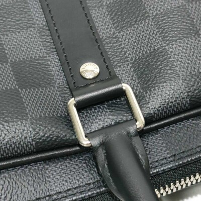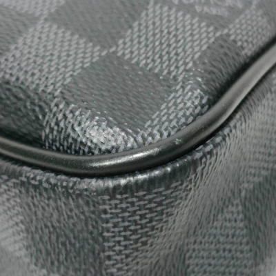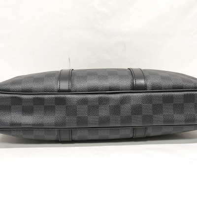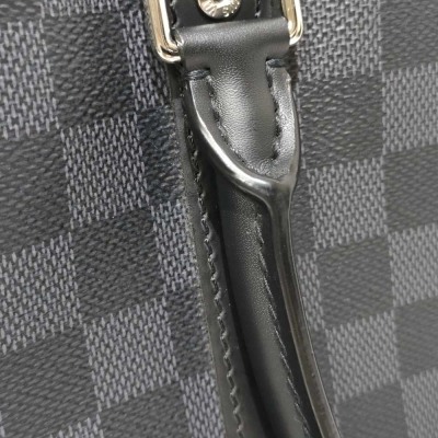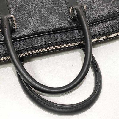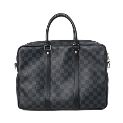 Louis Vuitton Porte-Documents Voyage PM briefcase in Damier Graphite coated canvas with leather trim (RFID confirmed, circa: after 2021). Featuring silver-toned hardware, rolled leather top handles and a detachable leather strap with shoulder pad. The top with zipper closure opens to a black textile lining interior with patched pockets. Approximate dimensions: 36cm(L) x 27cm(H) x 6cm(D), with a 11.5cm handle drop and 50cm adjustable strap drop. Accompanied by a Louis Vuitton padlock and keys. With Entrupy Certificate of Authenticity.