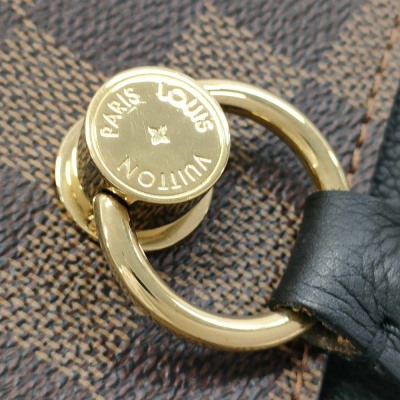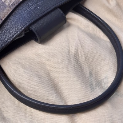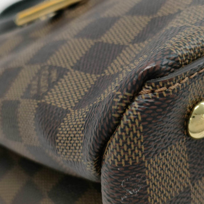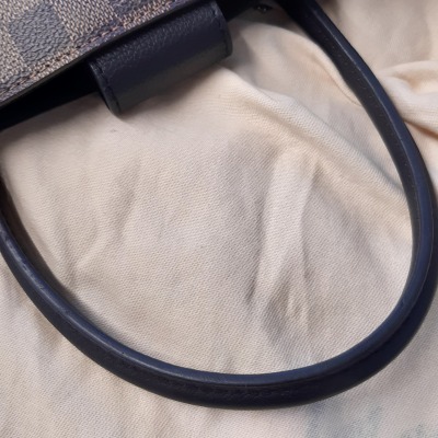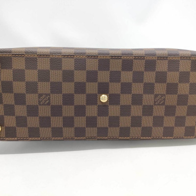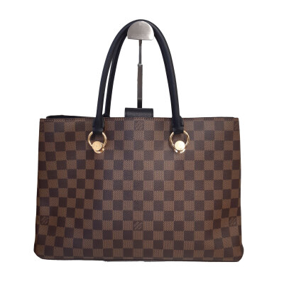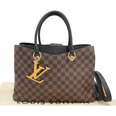 Louis Vuitton Riverside bag in Damier Ebene coated canvas. Featuring gold-toned hardware, dual top handles, front slip pocket with magnetic closure, and Epi-textured resin LV charm. The top opens to a black microfibre interior with two compartments with a patch pocket, divided by a zip pocket. Approx dimensions: 35cm(L) x 24cm(H) x 12cm(D), handle drop 14cm and shoulder strap: 41cm. Accompanied by LV dustbag. With Entrupy Certificate of Authenticity. (Pre-owned)