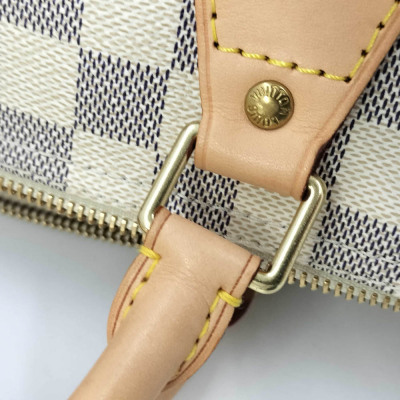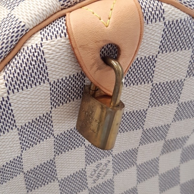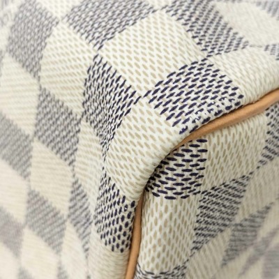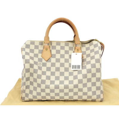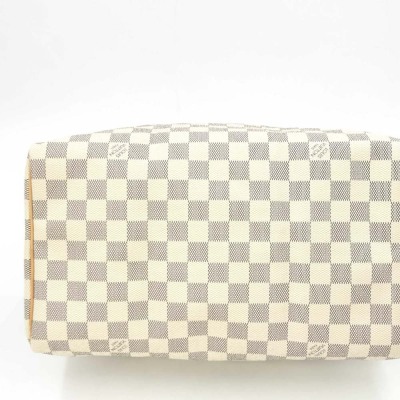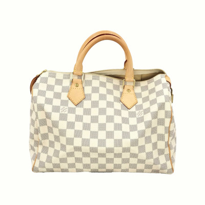 Louis Vuitton Speedy 30 in Damier Azure coated canvas and with leather trims. Featuring gold-toned hardware, and dual rolled vachetta leather handles. The zipper closure opens to a beige textile interior with a hanging patched pocket. Approximate dimensions: 30cm(L) x 20.5cm(H) x 18cm(D), handle drop 8cm. Accompanied by padlock and LV dustbag. Note: NO key included. With Entrupy Certificate of Authenticity. (Pre-owned)
