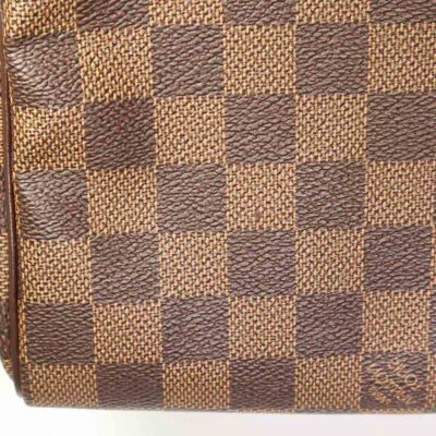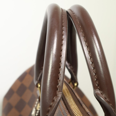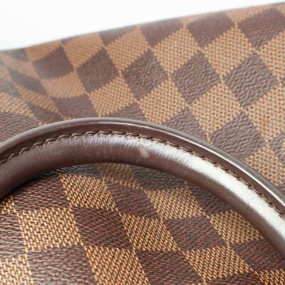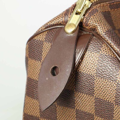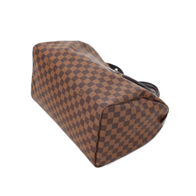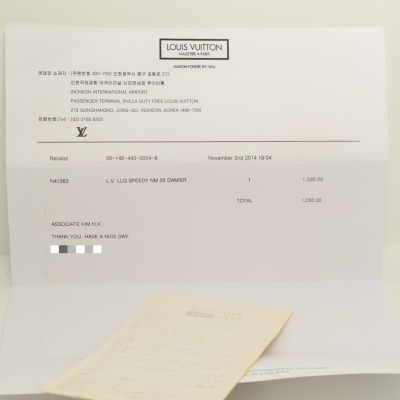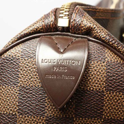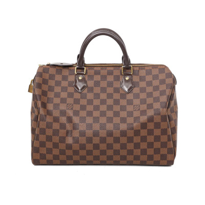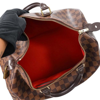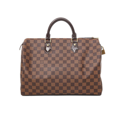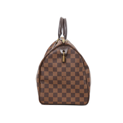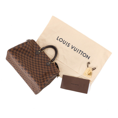 Louis Vuitton Speedy 35 in Damier Ebene coated canvas and brown leather trim (circa: 2014). Featuring gold-toned hardware and dual brown leather top handles. The top zipper opens to a red textile interior with a patch pocket. Approximate dimensions: 35cm(W) x 23cm(H) x 19cm(D), with a 8cm handle height. Accompanied by a Louis Vuitton purchase receipt (dated 02/11/2014), padlock with keys, dustbag and paper shopping bag.