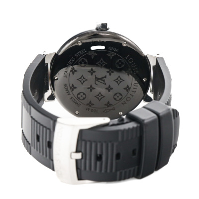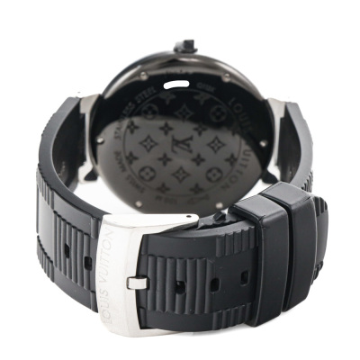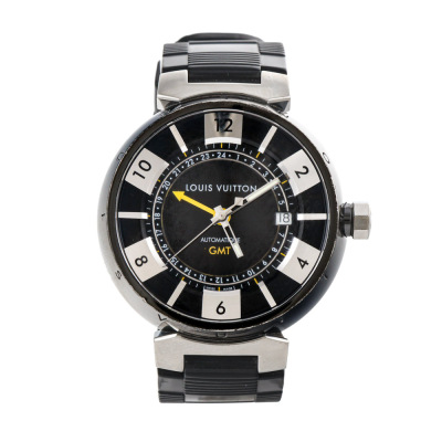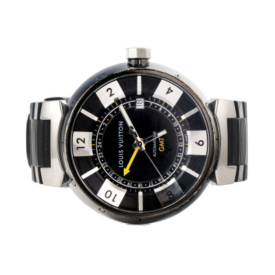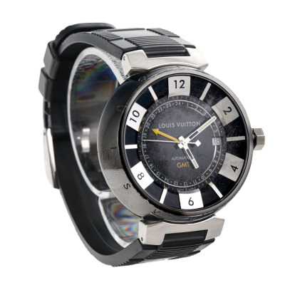 Louis Vuitton Tambour GMT stainless steel automatic mens watch. Black dial, date, case diameter: 42mm, max wrist size: 19.5cm, Swiss made. Ref# Q113K. With Louis Vuitton black rubber strap and buckle. With Certificate of Authenticity. No warranty applies. Weight: 104.4g.