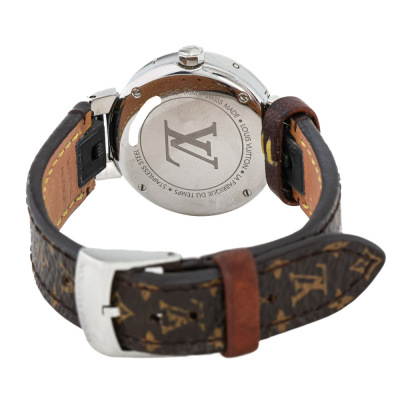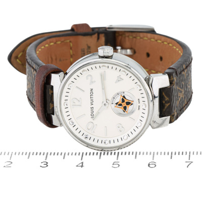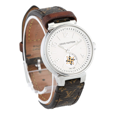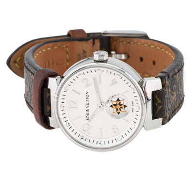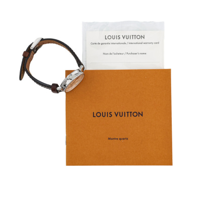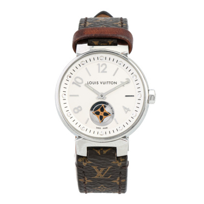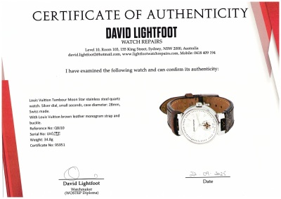 Louis Vuitton Tambour Moon Star stainless steel quartz ladies watch. Silver dial, small seconds, case diameter: 28mm, max wrist size: 16.5cm, Swiss made. Ref# Q8J10. With Louis Vuitton brown leather monogram strap and buckle. With Certificate of Authenticity, Louis Vuitton International Warranty card dated 10/01/2021 and Louis Vuitton box. No warranty applies. (Pre-owned)