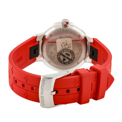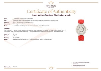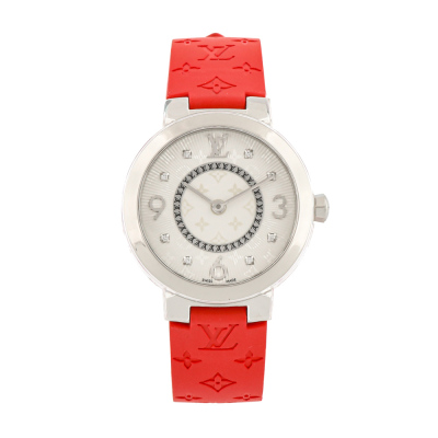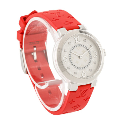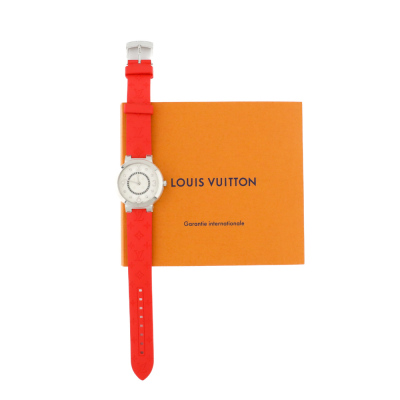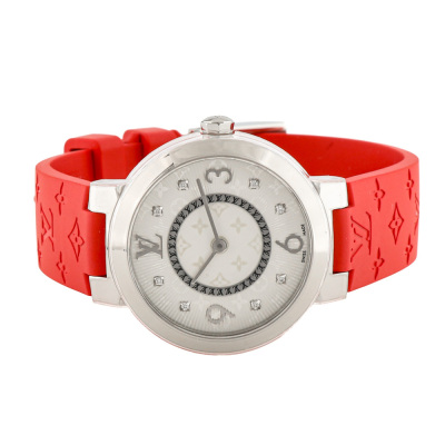 Louis Vuitton Tambour Slim stainless steel quartz ladies watch. Silver dial, Diamond Indicators, case diameter: 28mm, max wrist size: 17.5cm, Swiss made. Ref# Q12MG. With Louis Vuitton red rubber strap and buckle. With Certificate of Authenticity, undated Louis Vuitton International Guarantee booklet and Louis Vuitton box. No warranty applies.