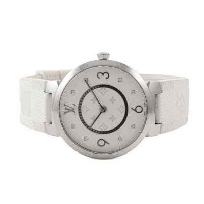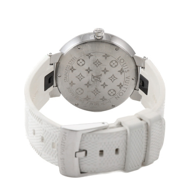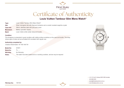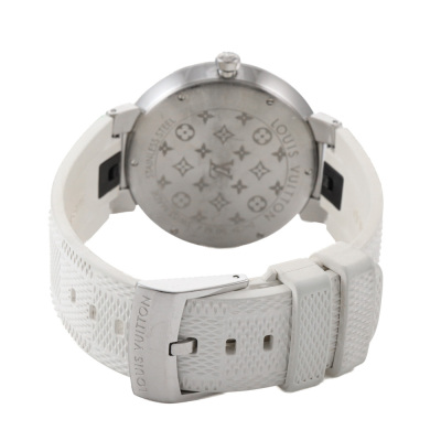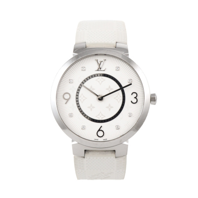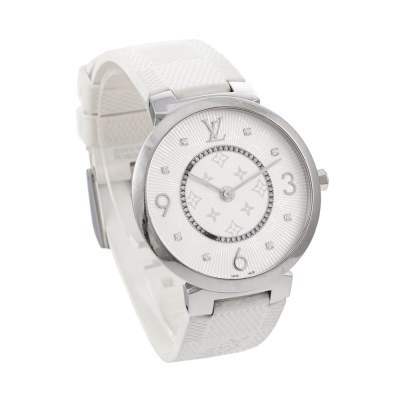 Louis Vuitton Tambour Slim stainless steel quartz mens watch. Silver monogram dial, Diamond indicators, case diameter: 39mm, max wrist size: 19.5cm, Swiss made. Ref# Q1E01. Estimated production period: 2024-2025. With Louis Vuitton white rubber strap and buckle. With Certificate of Authenticity and Louis Vuitton box. No warranty applies. Weight: 70.4g