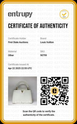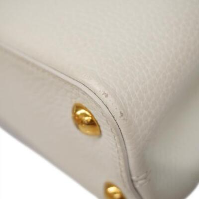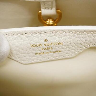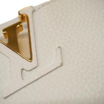 Louis Vuitton Capucines BB in white Taurillon leather. Featuring gold-toned hardware, leather-wrapped LV initials, and single leather handle. The flap and hook closure open to a pink leather interior with two compartments and a zipper pocket. Approximate dimensions: 26.5cm(Base-L) x 17.5cm(H) x 9cm(D), handle drop 9cm, adjustable and detachable strap 58cm. With Entrupy Certificate of Authenticity. (Pre-owned)