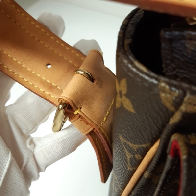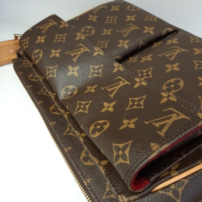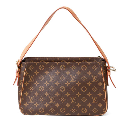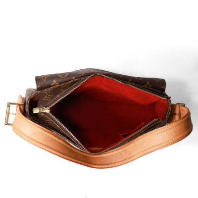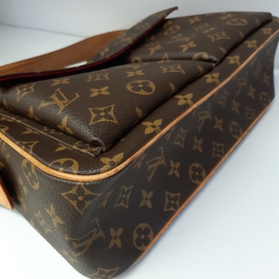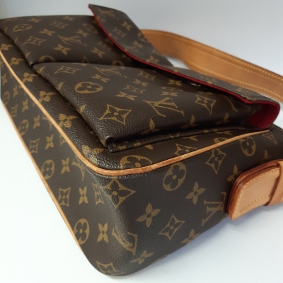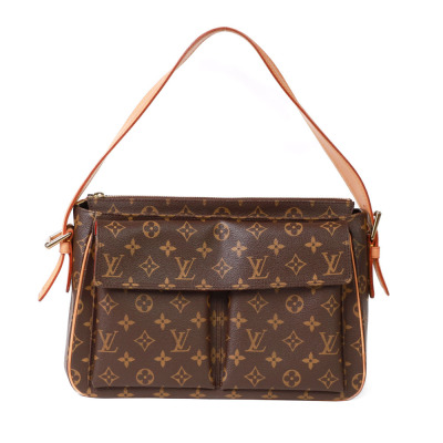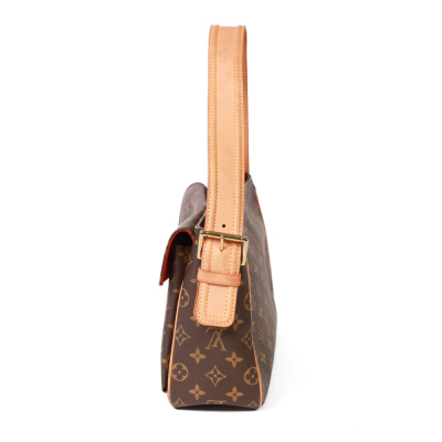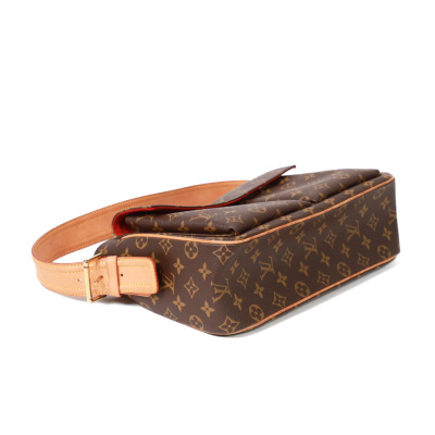 Louis Vuitton Viva Cite GM in Monogram coated canvas. Featuring gold-toned hardware, vachetta cowhide leather trim, two exterior pockets with a flap with magnetic buttons. The top zipper closure opens to a red microfibre interior with patch pockets. Approximate dimensions: 31cm(L) x 23cm(H) x 10cm(D), shoulder strap drop 24cm, adjustable. With Entrupy Certificate of Authenticity. (Pre-owned)