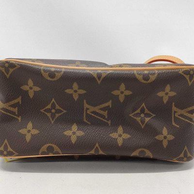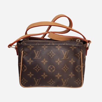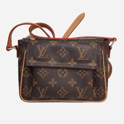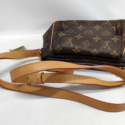 Louis Vuitton Viva Cite PM in Monogram coated canvas and with brown leather trims. Featuring gold-toned hardware, an exterior pocket with a flap closure. The top zipper opens to a red microfiber interior. Approx dimensions: 18.5cm(B-W) x 12cm(H) x 8cm(D), 59cm shoulder drop, adjustable. With Entrupy Certificate of Authenticity. (Pre-owned)