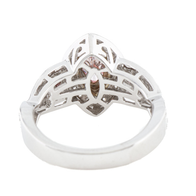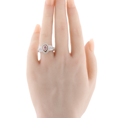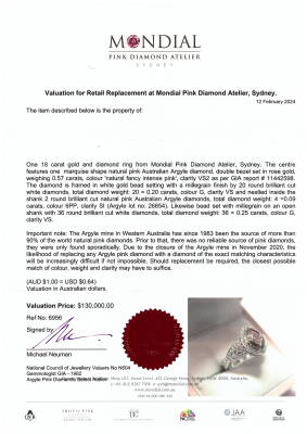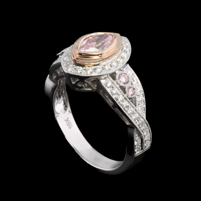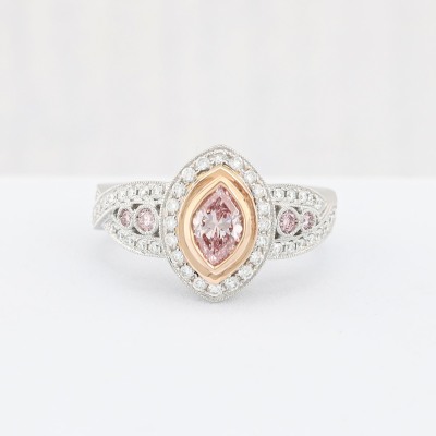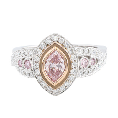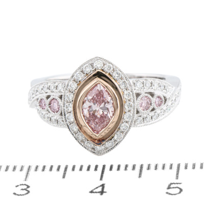 Mondial Diamond ring with marquise cut Natural Pink Diamond of 0.57ct (Copy of GIA Report graded as Fancy Intense Pink Even VS2 #11442598), 4 round Natural Argyle Pink Diamonds totalling 0.09ct (with Argyle lot #26854 graded as 6PP SI ) and remaining round Natural Diamonds totalling 0.45ct (Estimated grading: G VS). 18ct white & rose gold. Ring size M. Band width: 3.2mm - 4.0mm. Weight: 6.7g. With Mondal Valuation dated 12/02/24.(Pre-owned)