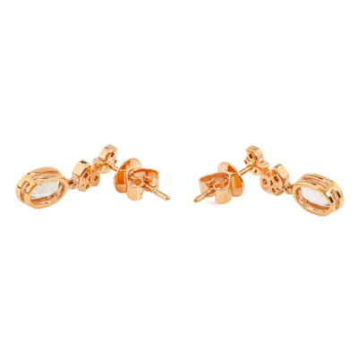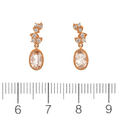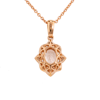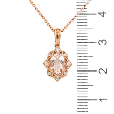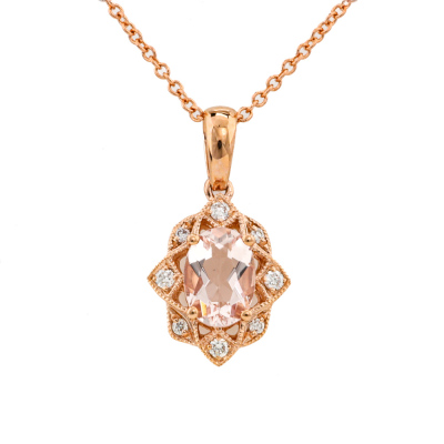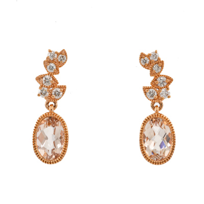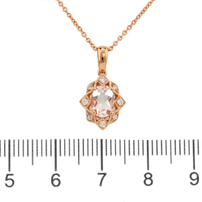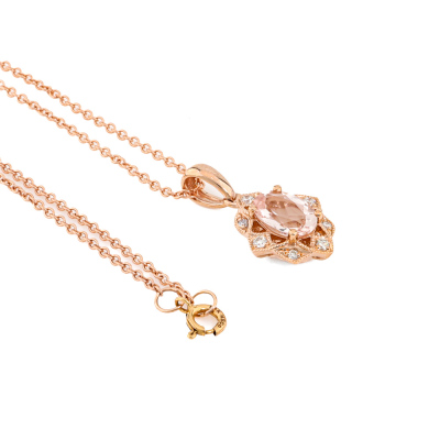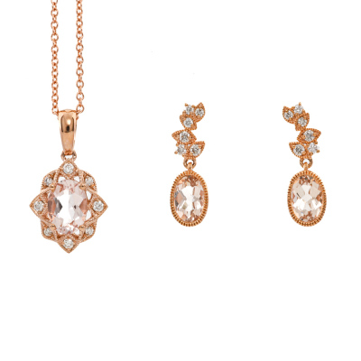 Pendant and earrings set. 1) Morganite and Diamond earrings with an oval Natural morganite of 0.84ct and round Natural Diamonds totalling 0.13ct. 2) With matching morganite and Diamond pendant with oval shape Natural Morganite of 0.65ct and round Natural Diamonds totalling 0.08ct. 14ct rose gold with 14ct 40.0cm rose gold chain attached. Total weight: 4.1g. (New)