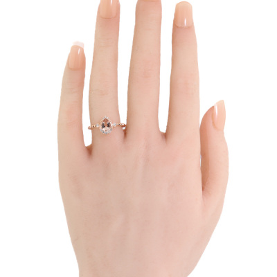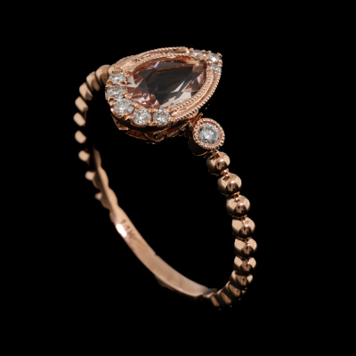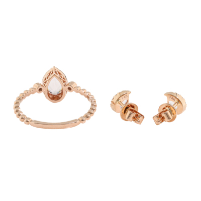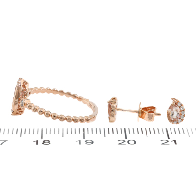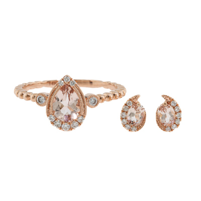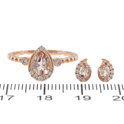 Ring and earrings set. 1) Morganite and Diamond ring with pear shape Natural Morganite of 0.54ct and round Natural Diamonds totalling 0.12ct. Ring Size: N. 2) With matching earrings with round Natural Morganites totalling 0.36ct and round Natural Diamonds totalling 0.06ct. Both 14ct rose gold. Total weight: 3.0g. (New)