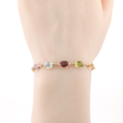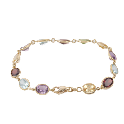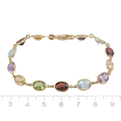 Multi-Colour Gemstone Bracelet with oval shape Natural Gemstones (including Peridot, Red Garnet, Blue Topaz, Amethyst, Citrine) of size approximately 7.7mm x 5.4mm. 18ct yellow gold. Length: 19cm. Weight: 7.3g. (Pre-owned)