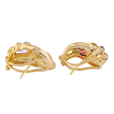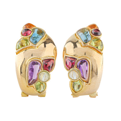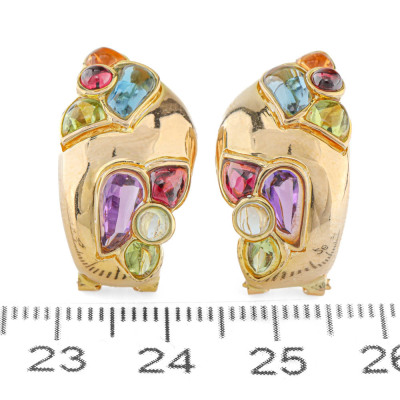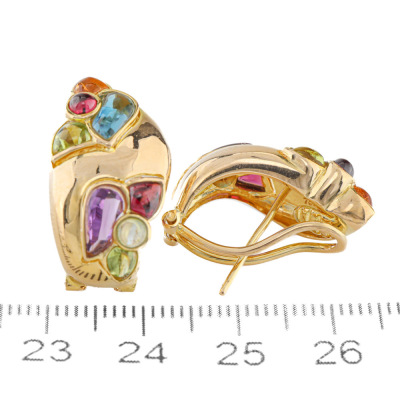 Clip-on earrings (for pierced ears) with round & fancy cabochon cut Natural Gemstones (Including Amethyst, Aquamarine, Citrine, Red Garnet, Pink Tourmaline, Blue Topaz and Peridot) of size 2.5mm - 7.8 x 4.0mm. 18ct yellow gold. Weight: 11.2g. (Pre-owned)