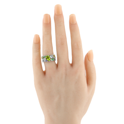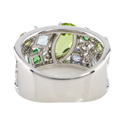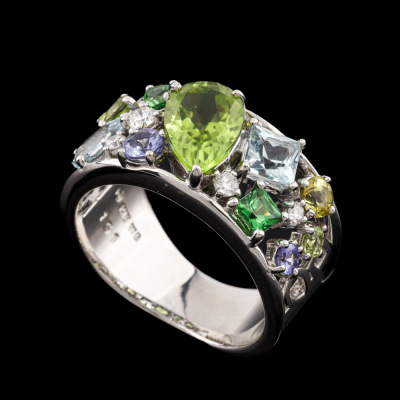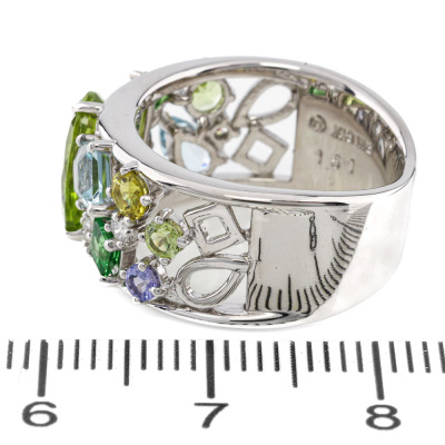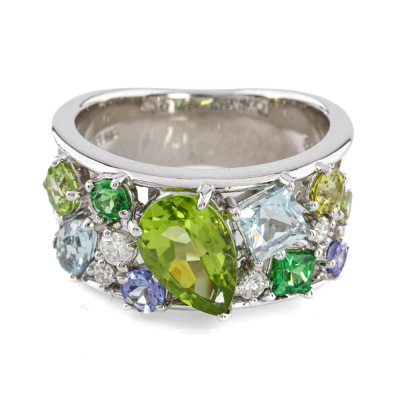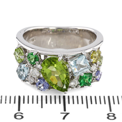 Multi-colour and Diamond ring with round & pear shape Natural Peridot totalling 1.51ct, pear & princess cut Natural Aquamarines totalling approximately 0.50ct, round & princess cut Natural Tsavorite Garnets totalling approximately 0.19ct, round Natural Tanzanite totalling approximately 0.17ct and round Natural Diamonds totalling 0.12ct. 18ct white gold. Ring size L. Band width: 5.9mm - 8.7mm. Weight: 9.1g (Pre-owned)