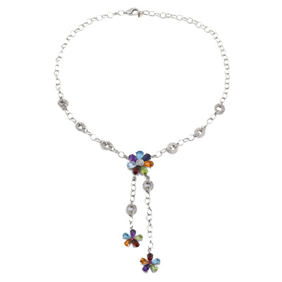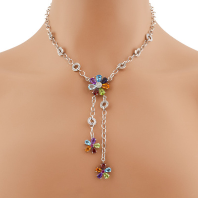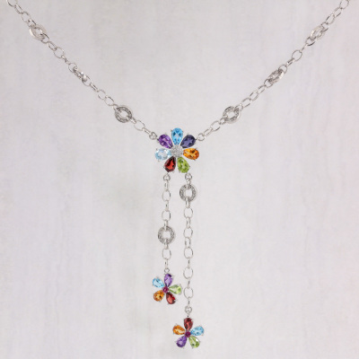 Lariat necklace with pear shape Natural Gemstones (including blue Topaz, Citrine, Amethyst, Tanzanite, Peridot, Garnet & pink Tourmaline) totalling 7.50ct and round Natural Diamonds totalling 0.50ct (Estimated grading: H-I SI-P1). Flower motif size: 2cm & 1.5cm. 18ct white gold. Adjustable max length: 41.5 cm. Weight: 23.7g. (Pre-owned)