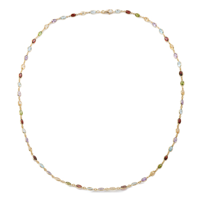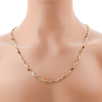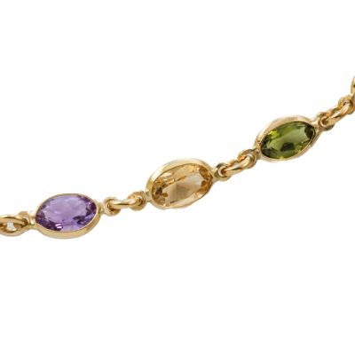 Multicolour Gemstone necklace with oval shape Natural blue Topaz, Citrine, Amethyst, Peridot & red Garnet measuring size approximately 5.8mm x 4.0mm. 18ct yellow gold. Length: Length: 61cm. Weight: 14.6g.