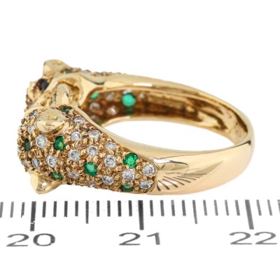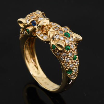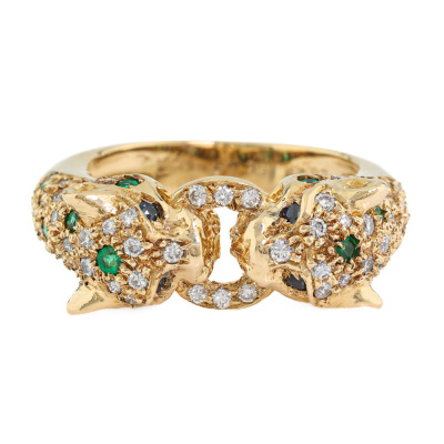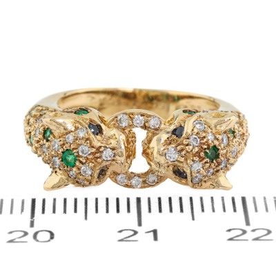 Panther design ring with round Natural Emerald totalling 0.28ct, round Natural Blue Sapphire totalling 0.07ct and round Natural Diamonds totalling 0.52ct (Estimated grading: G-H SI). 18ct yellow gold. Ring size K. Band width: 3.3mm - 4.6mm. Weight: 7.4g. (Pre-owned)