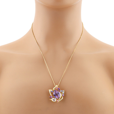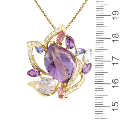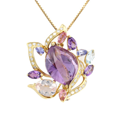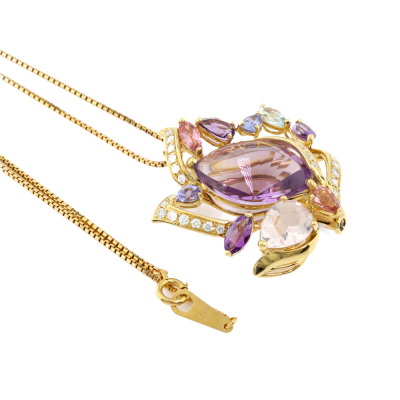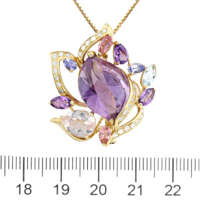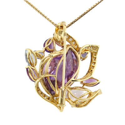 Multi-colour gemstone and Diamond pendant/brooch with mixed cut Natural Amethyst, pink Tourmaline, Tanzanite, blue Topaz & Morganite totalling 9.01ct and round Natural Diamonds totalling 0.31ct (Estimated grading: G VS). 18ct yellow gold with 45cm-50cm 18ct yellow gold adjustable chain. Weight: 13.5g.