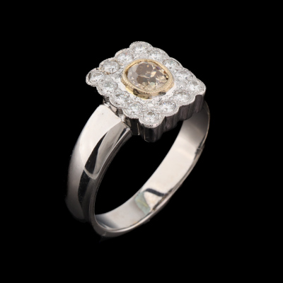 Diamond ring with centre old mine cut Natural Champagne Diamond of approximately 0.35ct (Estimated grading: Champagne P1) and surrounding round Natural Diamonds totalling approximately 0.45ct (Estimated grading: H-I SI). 18ct yellow and white gold. Ring size L3/4. Band width: 3.3mm - 4.3mm. Weight: 5.8g.