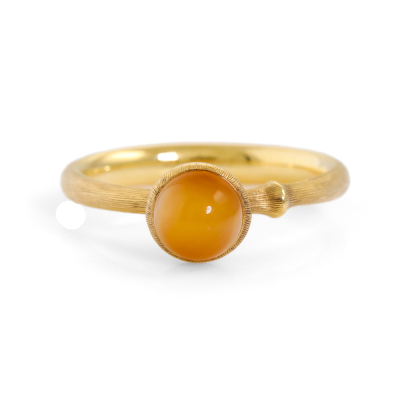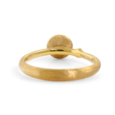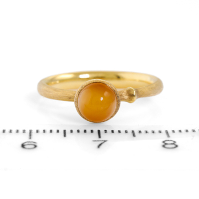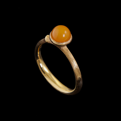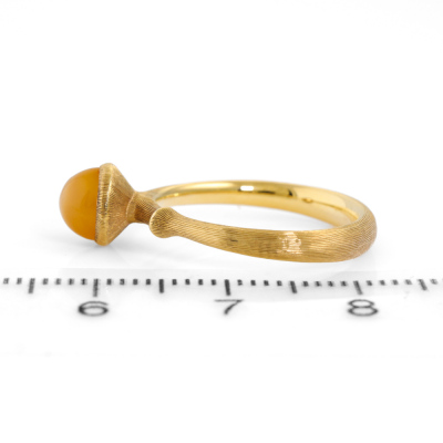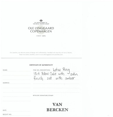 Ole Lynggaard Lotus ring set with a round cabochon cut Natural Amber 5.9mm in diameter. 18ct yellow gold with satin finish. Ring size L. Band width: 3.1mm-1.8mm. Weight: 3.6g. (As new)