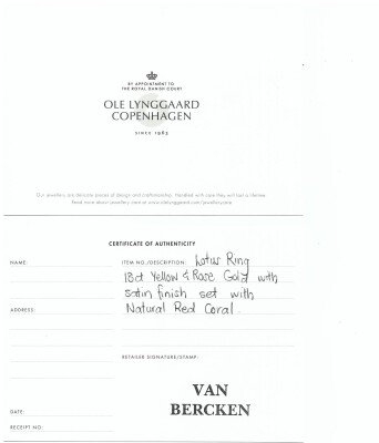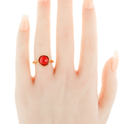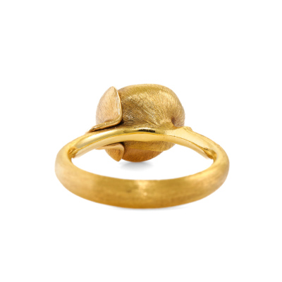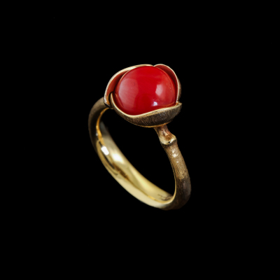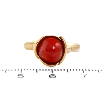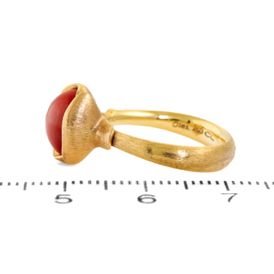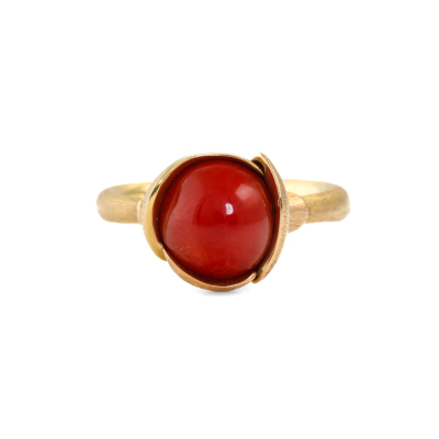 Ole Lynggaard Lotus ring set with a round cabochon cut Natural Coral of approximately 9mm in diameter. 18ct yellow gold with satin finish. Ring size J. Band width: 3.7mm - 2.2mm. Weight: 7.0g. (As new)