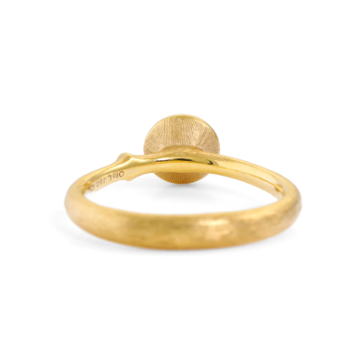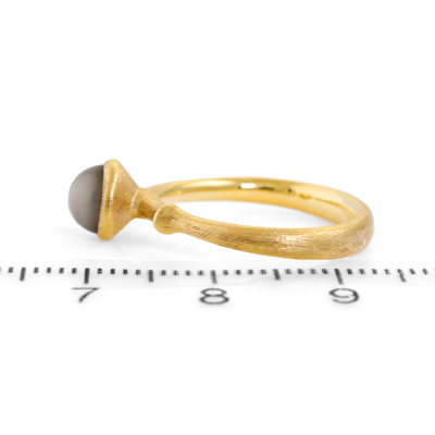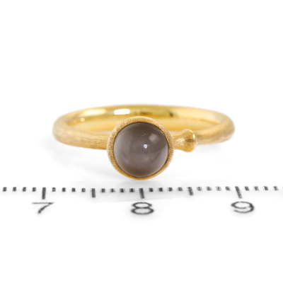 Ole Lynggaard Lotus ring set with a round cabochon cut Natural Grey Moonstone 5.8mm in diameter. 18ct yellow gold with satin finish. Ring size J1/2. Band width: 3.1mm-1.8mm. Weight: 3.9g. (As new)
