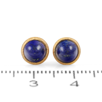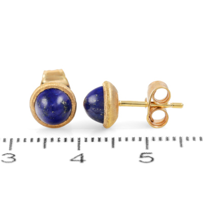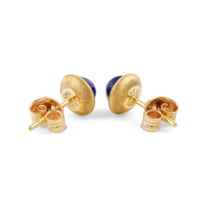 Ole Lynggaard Lotus stud earrings with round cabochon cut Natural Lapis lazuli. Diameter: 5.5mm. 18ct satin finished yellow gold with 18ct yellow gold backs. Weight: 2.1g. (As new)