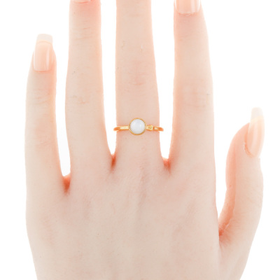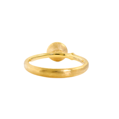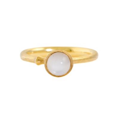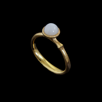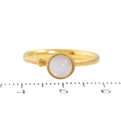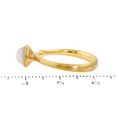 Ole Lynggaard Lotus ring set with a cabochon cut white Natural Moonstone 5.8mm in diameter. 18ct yellow gold with satin finish. Ring size M1/2. Band width: 3mm-1.8mm. Weight: 3.8g. (As new)