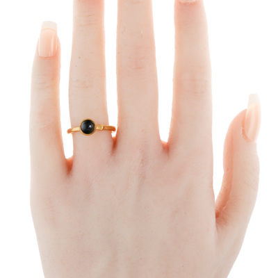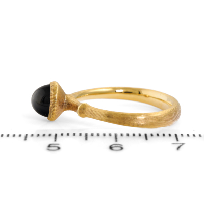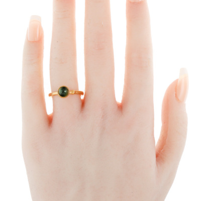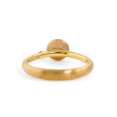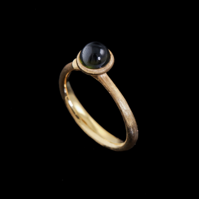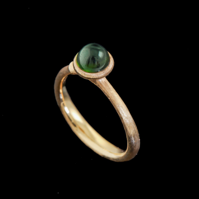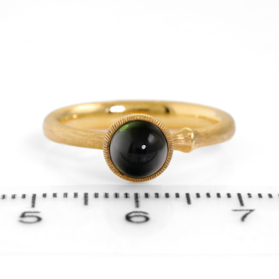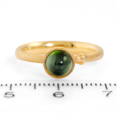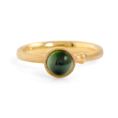 Ole Lynggaard Lotus ring set with a round cabochon cut Natural green Tourmaline 5.8mm in diameter. 18ct yellow gold with satin finish. Ring size L. Band width: 3.2mm-1.8mm. Weight: 4.3g. (As new)