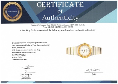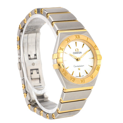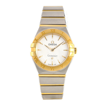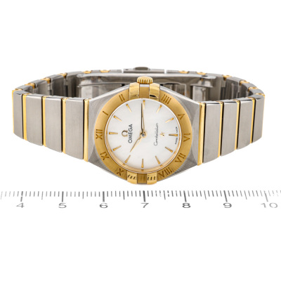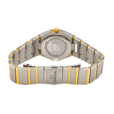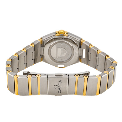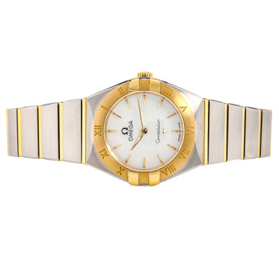 Omega Constellation 18ct yellow gold and stainless steel quartz ladies watch. Mother of Pearl dial, case diameter: 25mm, wrist size: 16cm, Swiss made. Ref# 131.20.25.60.05.002. With Omega two tone bracelet and clasp. With Certificate of Authenticity and Omega box. 3 month FSA warranty. Weight: 75.2g (Pre-owned)