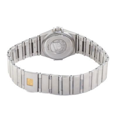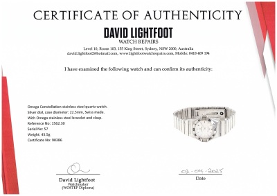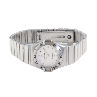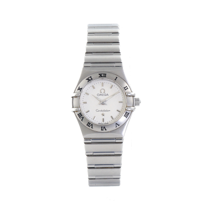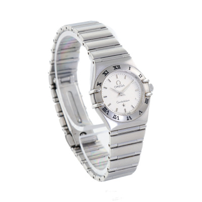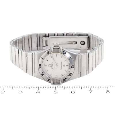 Omega Constellation stainless steel quartz ladies watch. Silver dial, case diameter: 22.5mm, wrist size: 17.5cm, Swiss made. Ref# 1562.30. With Omega stainless steel bracelet and clasp. With Certificate of Authenticity and Omega box. No warranty applies. (Pre-owned)