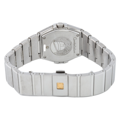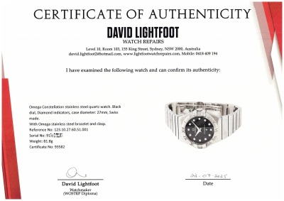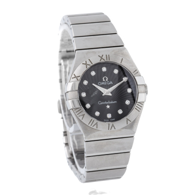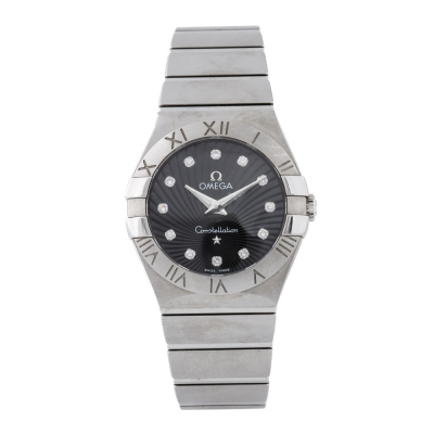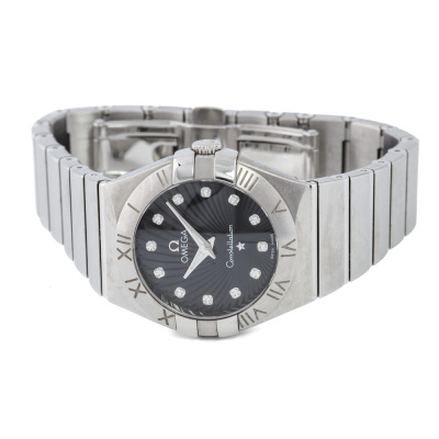 Omega Constellation stainless steel quartz ladies watch. Black dial, Diamond indicators, case diameter: 27mm, wrist size: 16.5cm, Swiss made. Ref# 123.10.27.60.51.001. With Omega stainless steel bracelet and clasp. With Certificate of Authenticity and Omega box. 3 month FSA warranty. (Pre-owned)