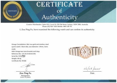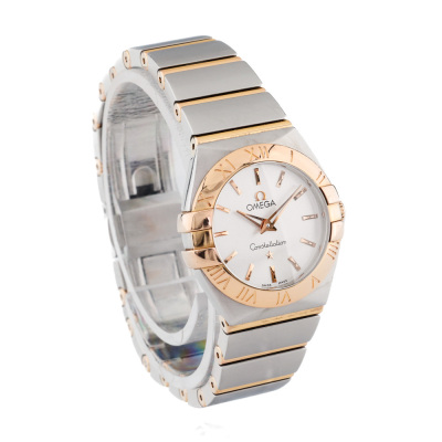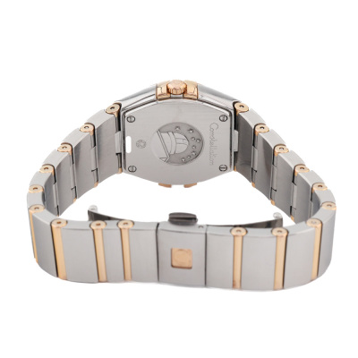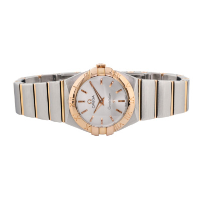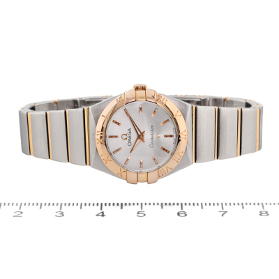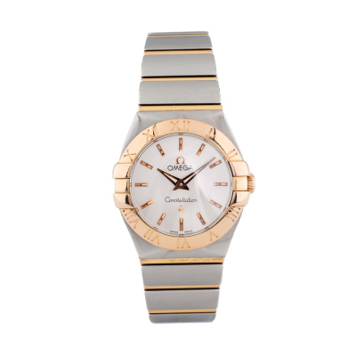 Omega Constellation 18ct rose gold and stainless steel quartz ladies watch. Silver dial, case diameter: 24mm, wrist size: 15cm, Swiss made. Ref# 123.20.24.60.02.001. With Omega two tone bracelet and clasp. With Certificate of Authenticity, Omega International Warranty card dated 16/12/2012, Pictograms card and Omega box. 3 month FSA warranty. (Pre-owned)