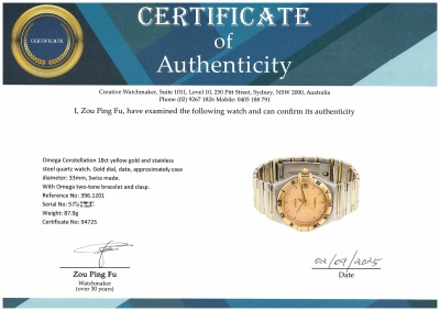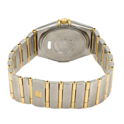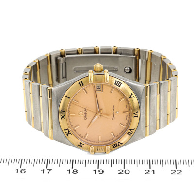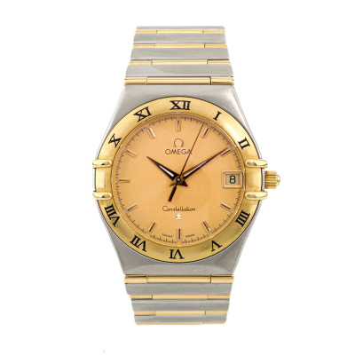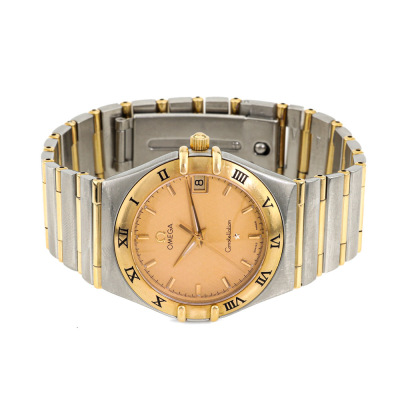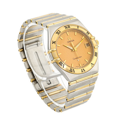 Omega Constellation 18ct yellow gold and stainless steel quartz watch. Gold dial, date, approximately case diameter: 33mm, wrist size: 17cm, Swiss made. Ref# 396.1201. With Omega two-tone bracelet and clasp. With Certificate of Authenticity. 3 month FSA warranty. (Pre-owned)