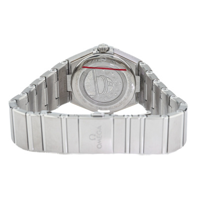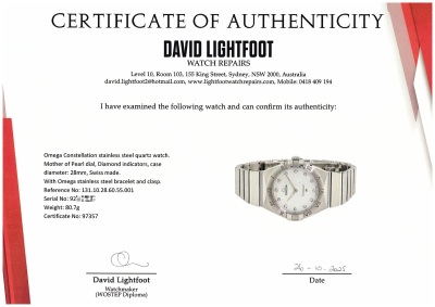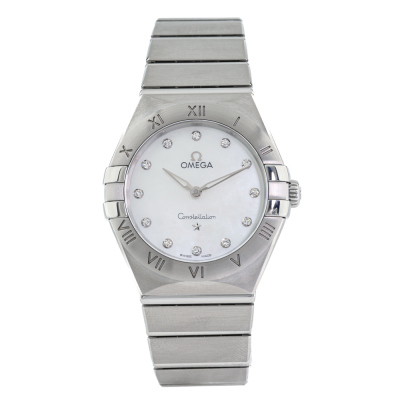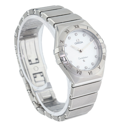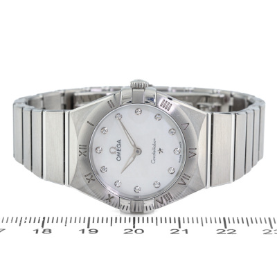 Omega Constellation stainless steel quartz ladies watch. Mother of Pearl dial, Diamond indicators, case diameter: 28mm, wrist size: 16.5cm, Swiss made. Ref# 131.10.28.60.55.001. With Omega stainless steel bracelet and clasp. With Certificate of Authenticity, Omega International Warranty card dated 05/2019, Precious Gemstones Certificate card, Pictograms card and Omega box. 3 month FSA warranty. Weight: 80.7g (Pre-owned)