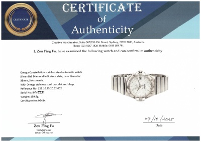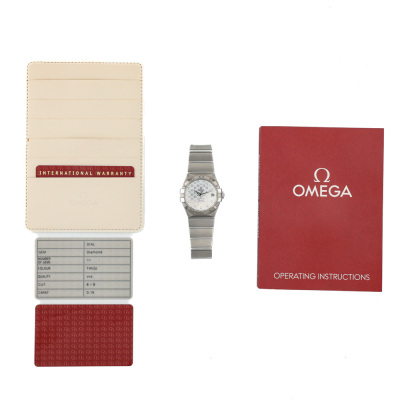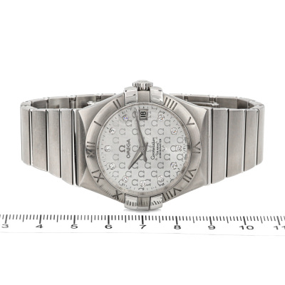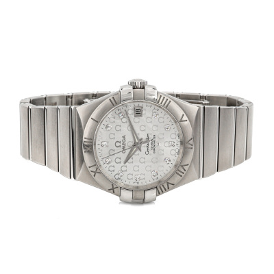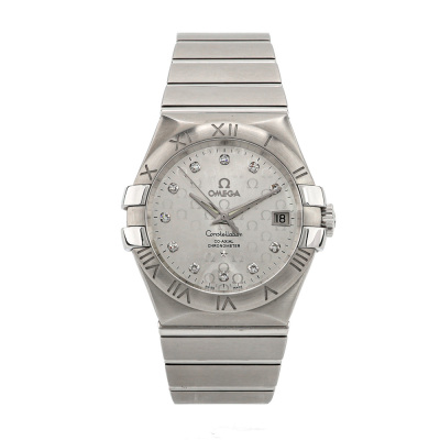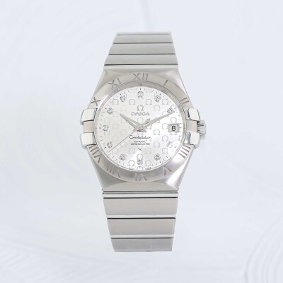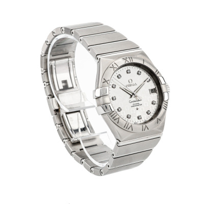 Omega Constellation stainless steel automatic watch. Silver dial, Diamond indicators, date, case diameter: 35mm, wrist size: 19cm, Swiss made. Ref# 123.10.35.20.52.002. With Omega stainless steel bracelet and clasp. With Certificate of Authenticity, Omega International Warranty card dated 02/11/2013, Precious Stones Certificate card, Pictograms card and Omega box. 3 month FSA warranty. Weight:139.9g (Pre-owned)