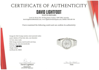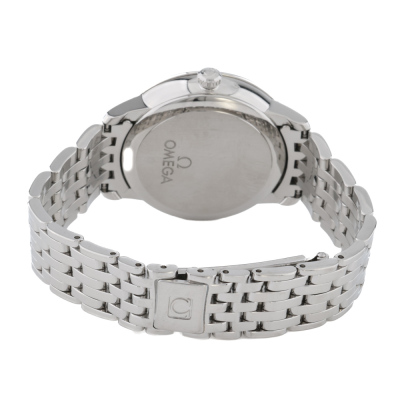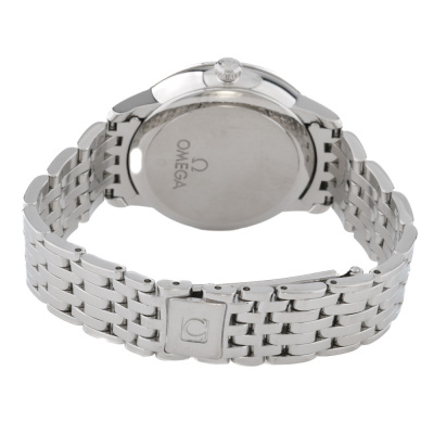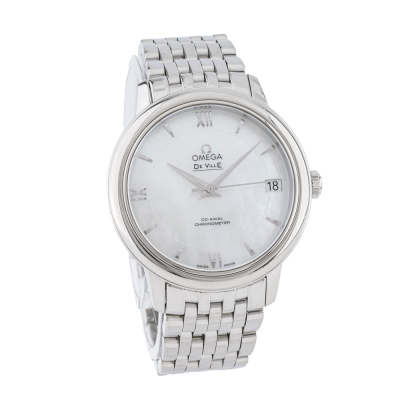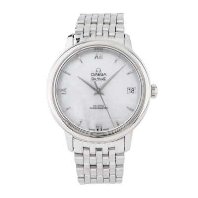Omega De Ville Prestige stainless steel automatic ladies watch. Mother of Pearl dial, date, case diameter: 32.7mm, wrist size: 15.5cm, Swiss made. Ref# 424.10.33.20.05.001. With Omega stainless steel bracelet and clasp. With Certificate of Authenticity. 3 month FSA warranty. Weight: 68.3g. (Pre-owned)